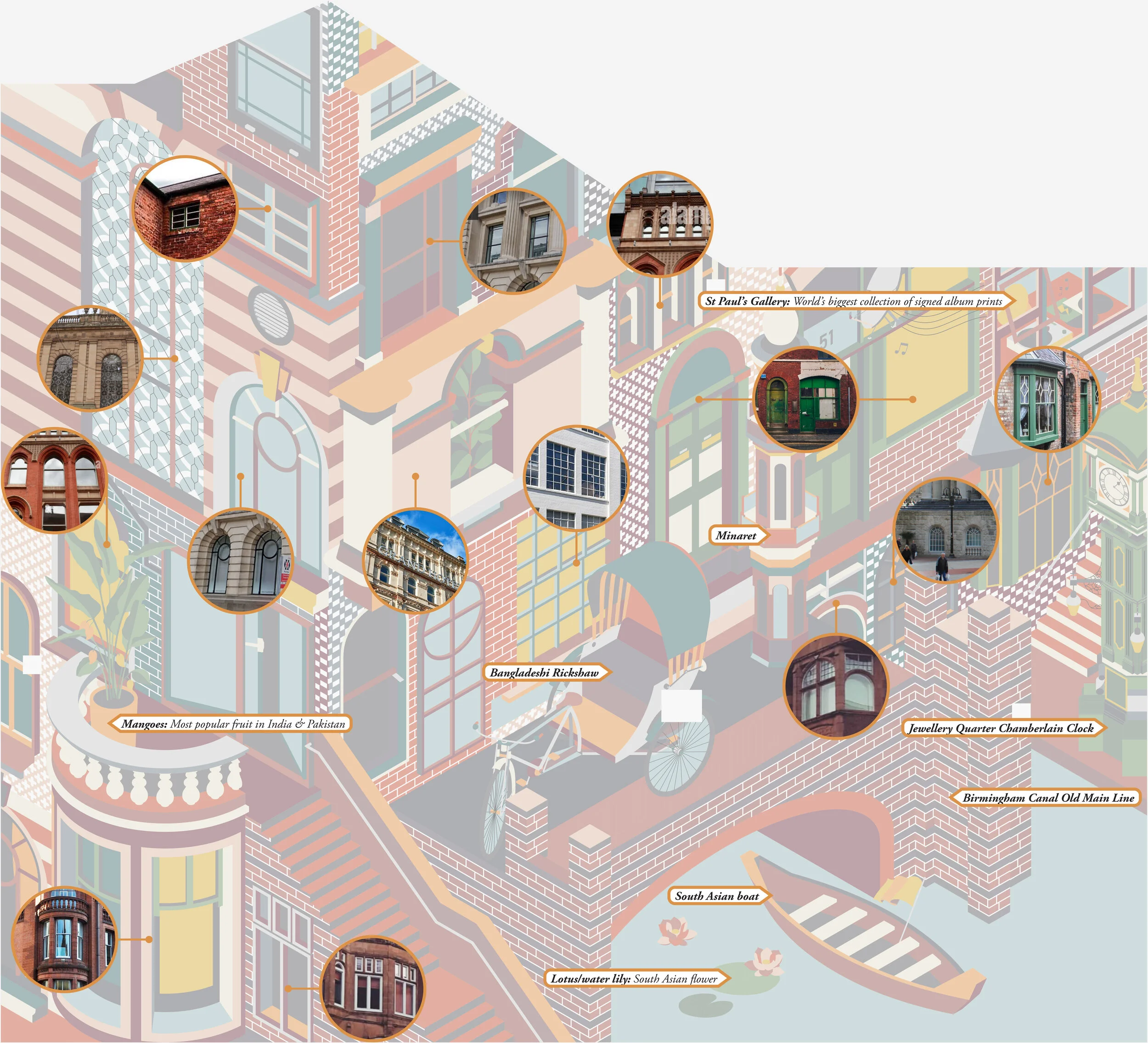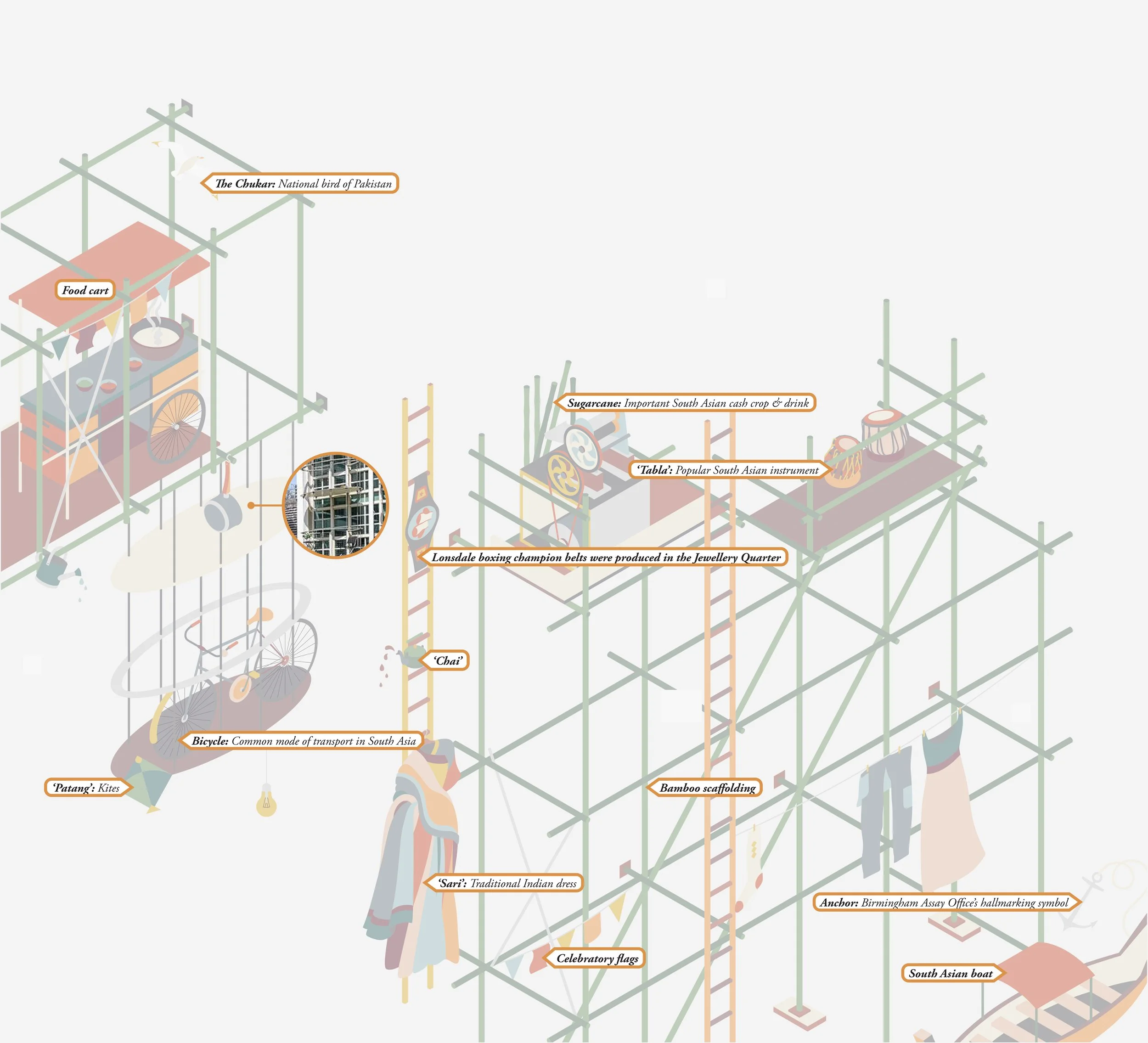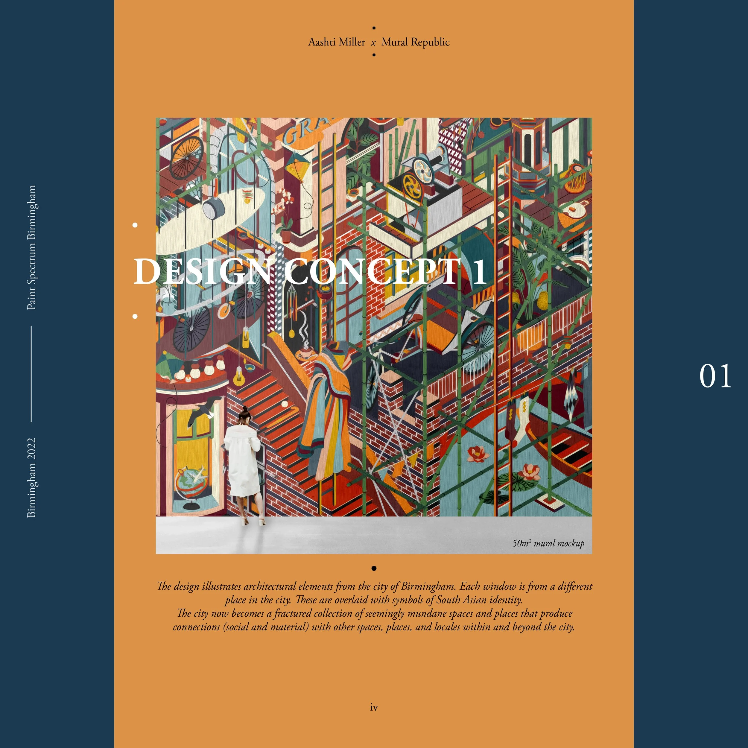My mural titled Saudade, illustrates architectural elements from the city of Birmingham. Each window is from a different place in the city. These are overlaid with symbols of South Asian identity. The city now becomes a fractured collection of seemingly mundane spaces and places that produce connections (social and material) with other spaces, places, and locales within and beyond the city.