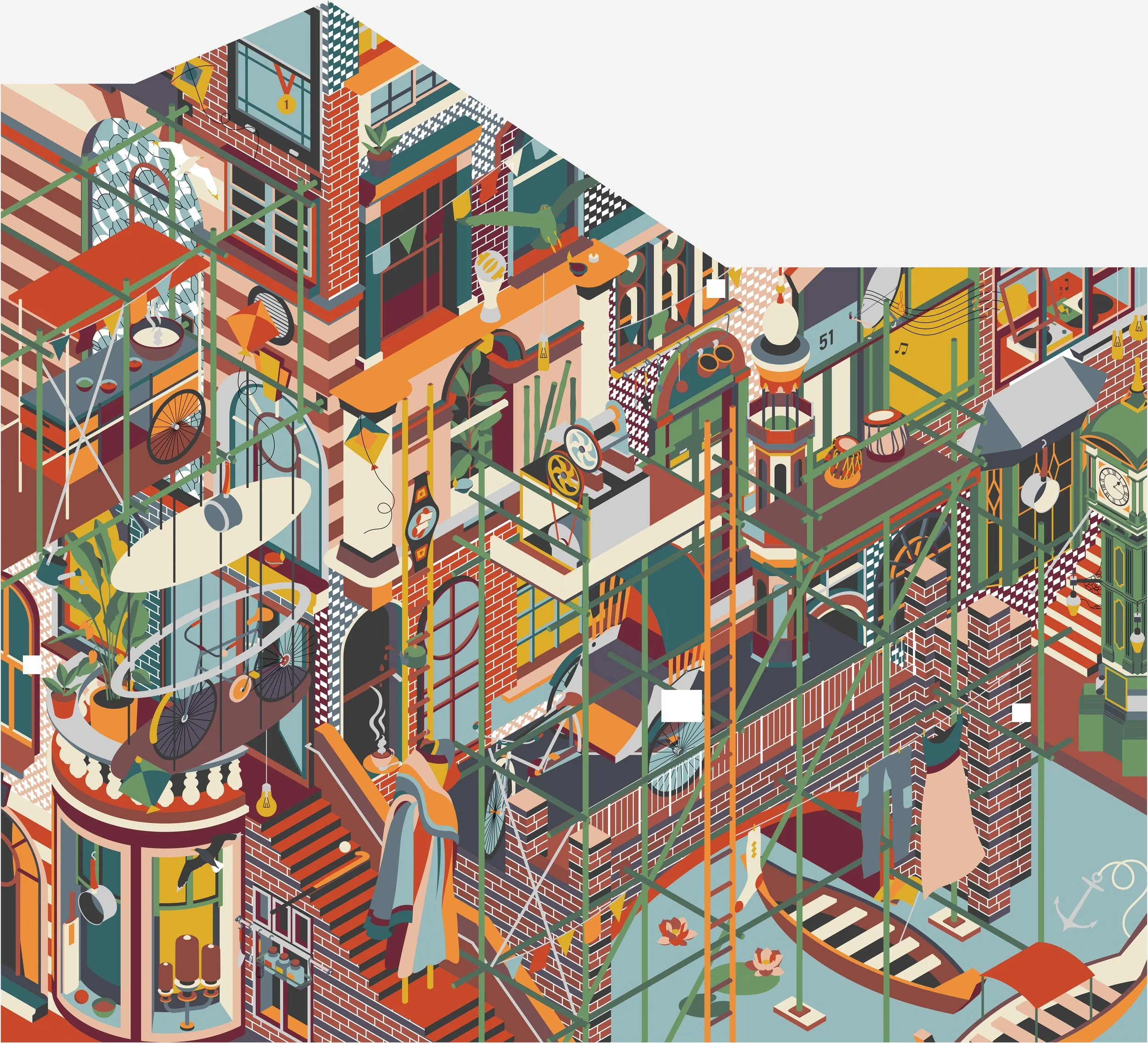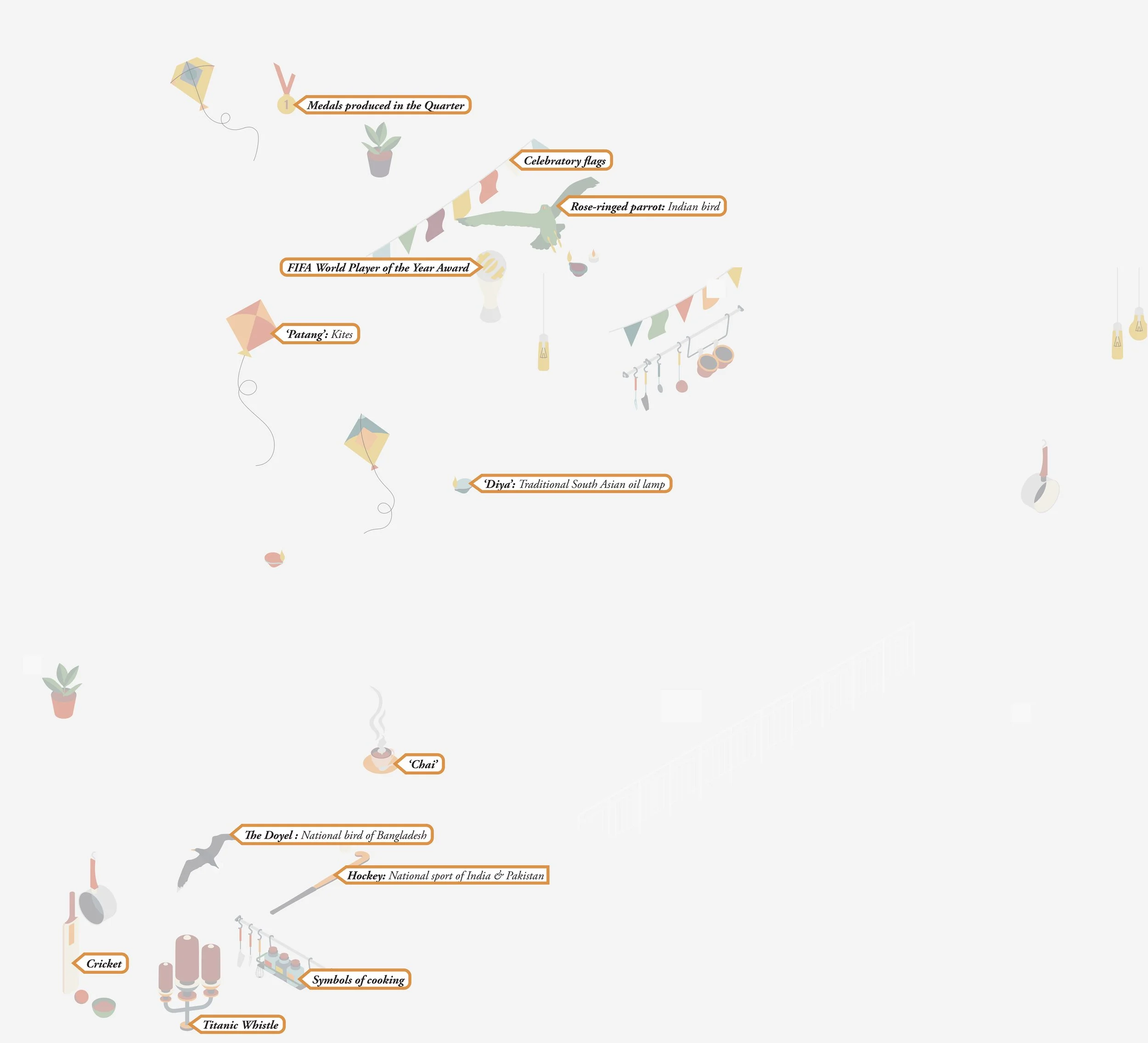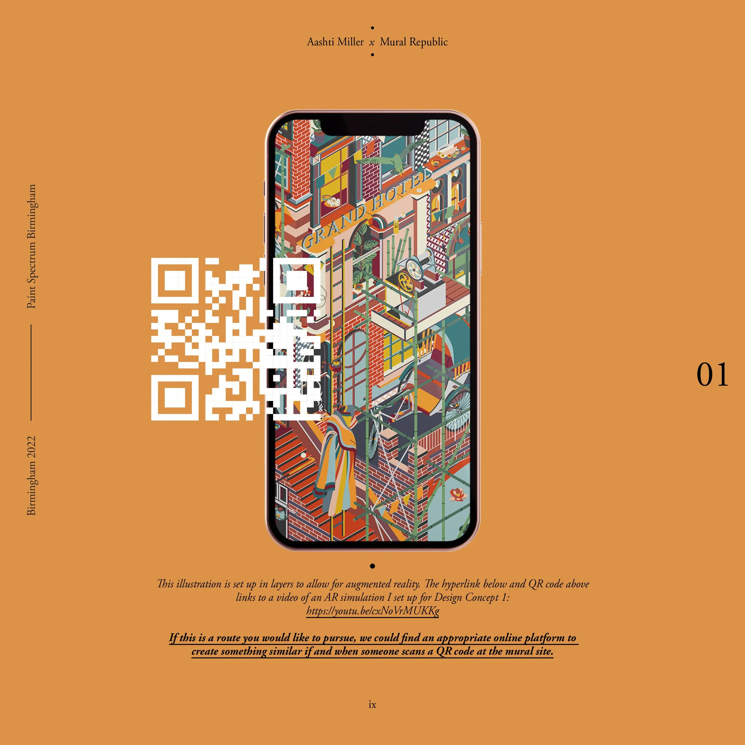 My mural titled Saudade, illustrates architectural elements from the city of Birmingham. Each window is from a different place in the city. These are overlaid with symbols of South Asian identity. The city now becomes a fractured collection of seemingly mundane spaces and places that produce connections (social and material) with other spaces, places, and locales within and beyond the city.